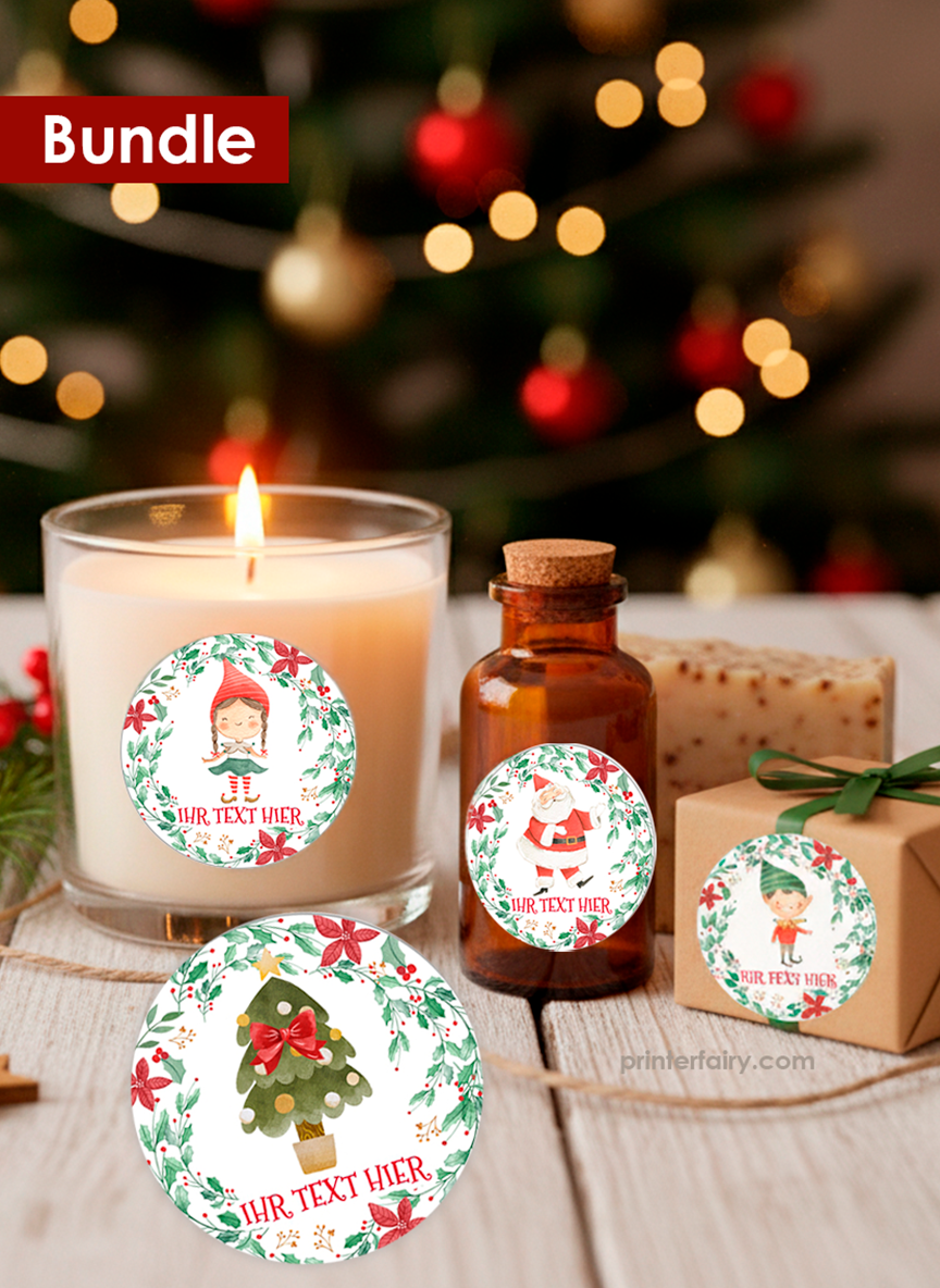 Komplett editierbares Set mit 4 runden Etiketten. Ideal zum Verzieren von Produkten, Geschenken oder Verpackungen. Perfekt für Märkte und kleine Geschäfte. Demo vor dem Kauf testen!