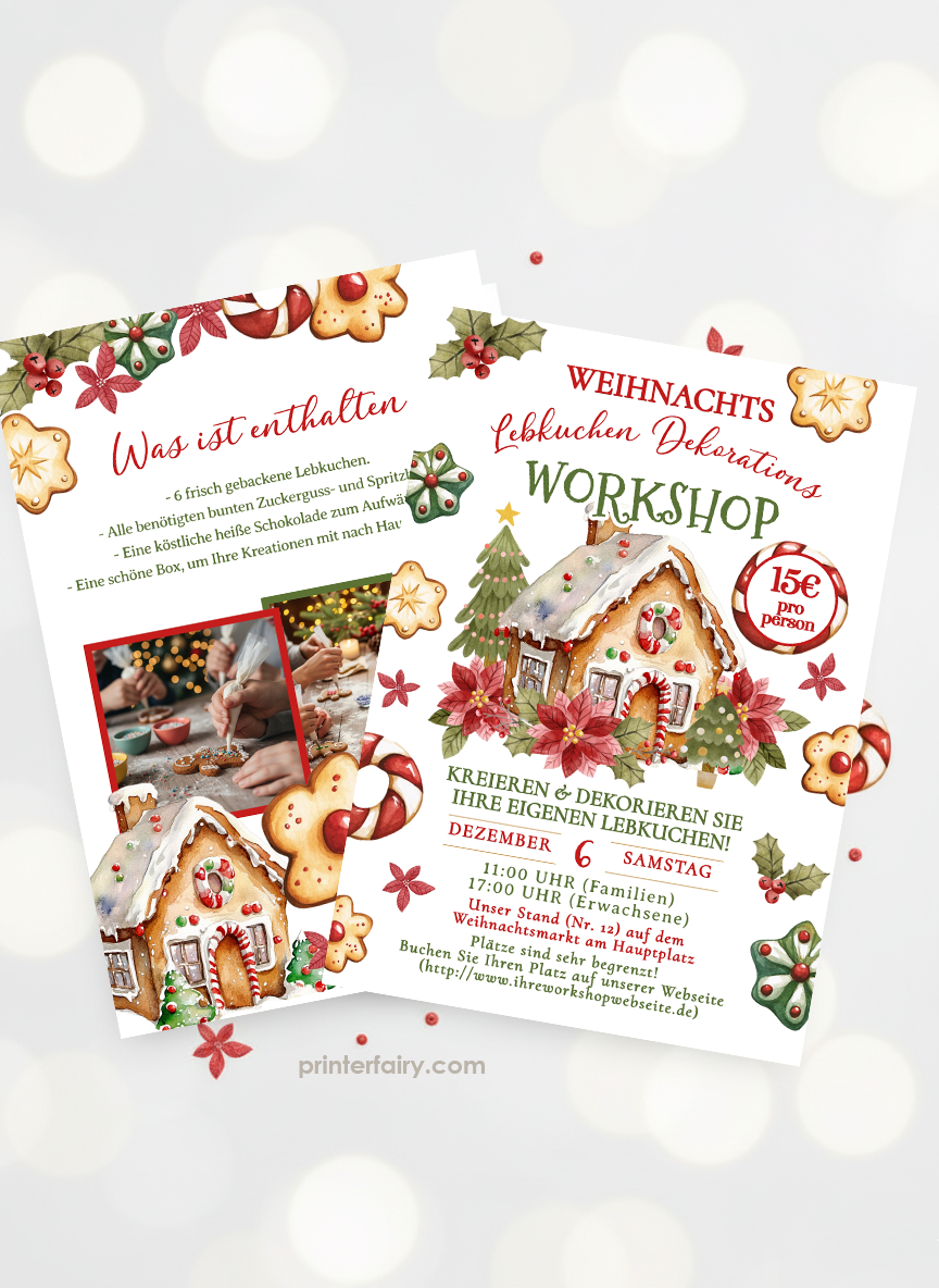 Präsentieren Sie Ihren Kurs strahlend mit unserer thematischen Flyer-Vorlage – perfekt für Lebkuchen-Workshops, Backkurse und andere kreative Winter-Events.