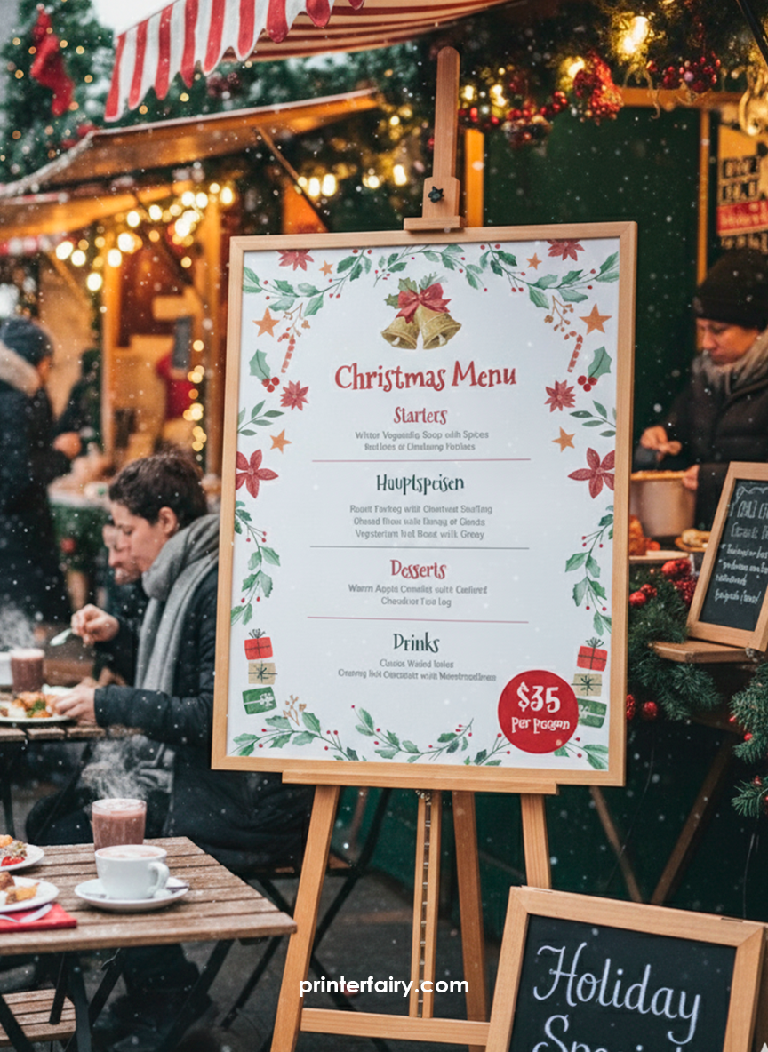 Ideal for Christmas dinners, parties, catering services, or small businesses that need clear and stylish menu displays. Use it digitally for online orders or print in the size that best fits your table, counter, or event setup.