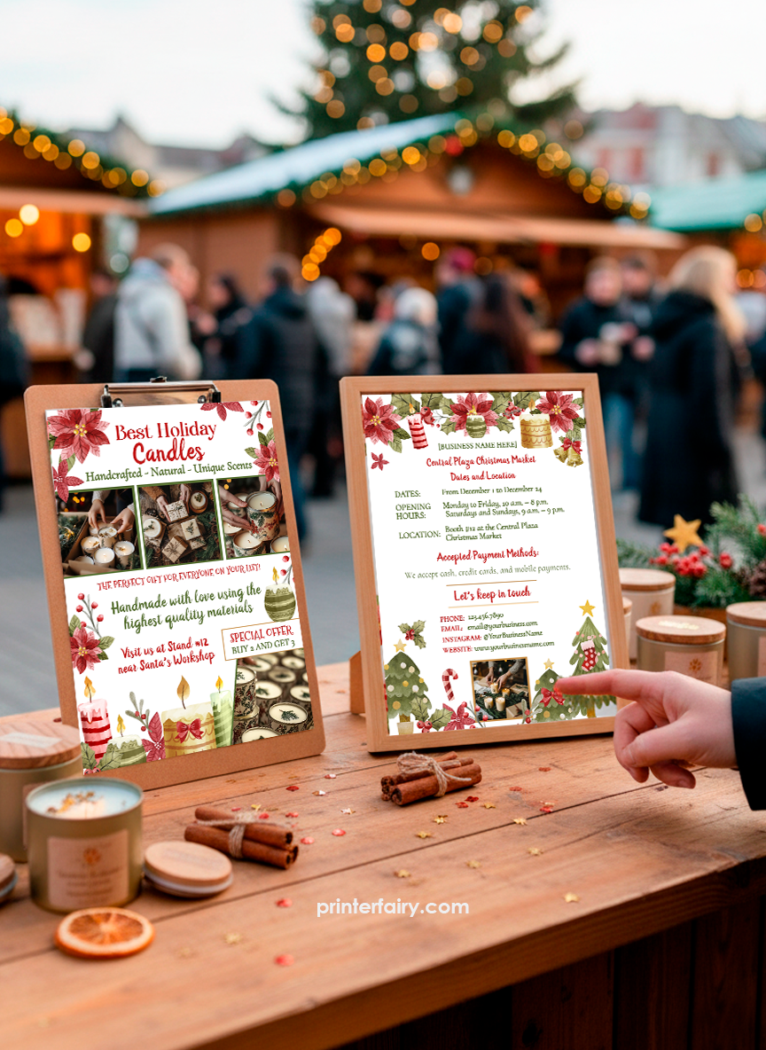 Editable Christmas Market Flyer Template for Candle Crafters! This customizable template is designed for Christmas craft vendors, with space to add your business information, photos, and Christmas market stand details. Perfect for promoting your handmade holiday candles! Try the demo in the link below before purchasing to see how it works.