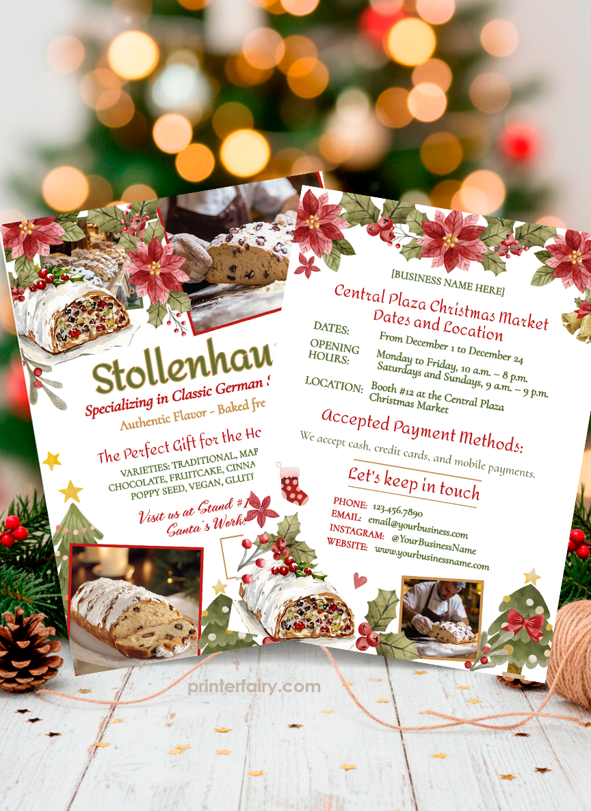 This customizable Christmas Market flyer template is perfect for bakers, artisan vendors, and holiday sellers. Easily add your business name, photos, menu items, and stand details to create a professional flyer in minutes.