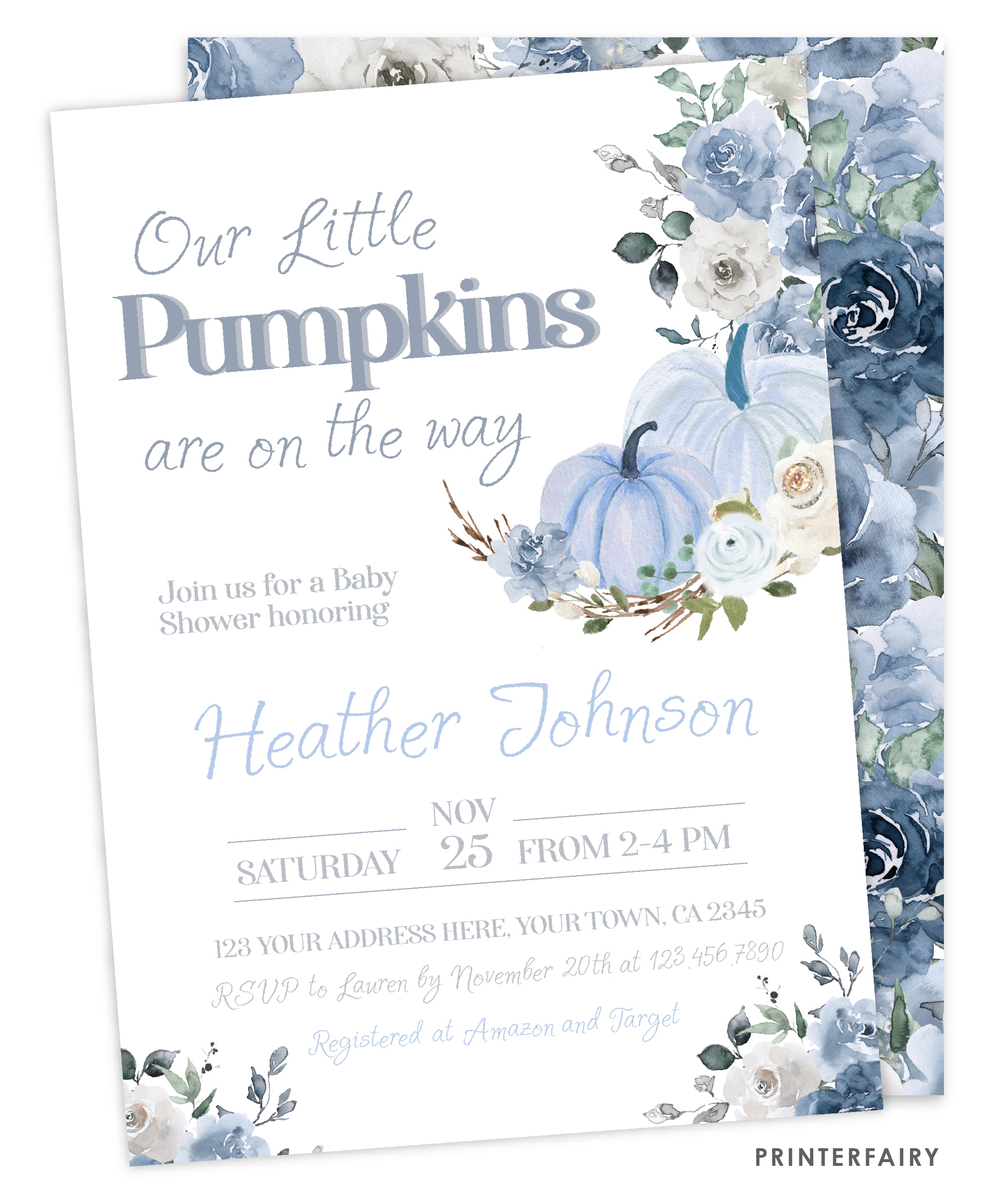 Dusty Blue Pumpkin Twins Baby Shower Invitation