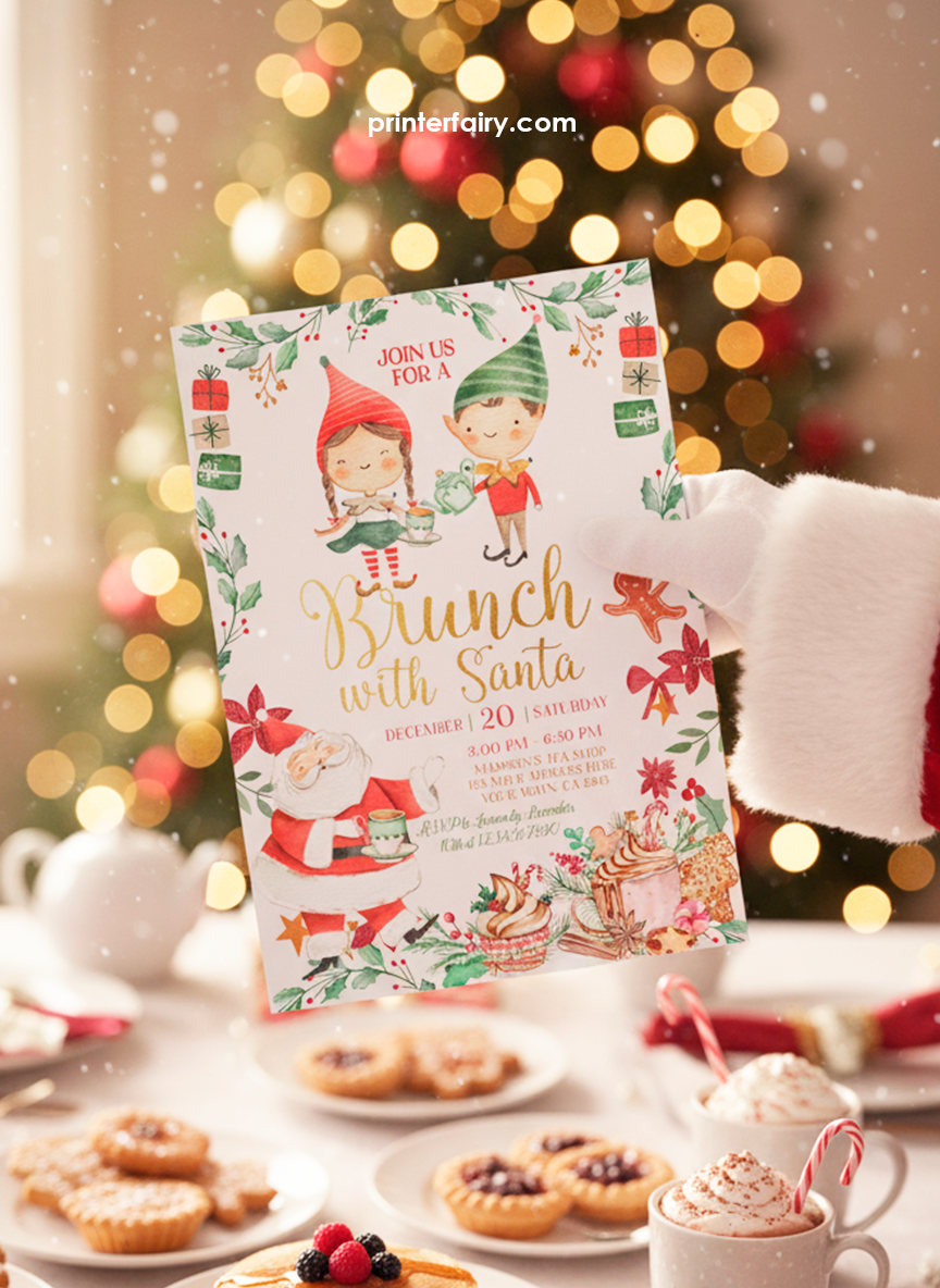 Ideal for hosting a magical Brunch with Santa, holiday breakfast, Christmas party, or seasonal community event. A fun and professional way to invite guests to enjoy holiday treats, Santa photos, and festive activities.