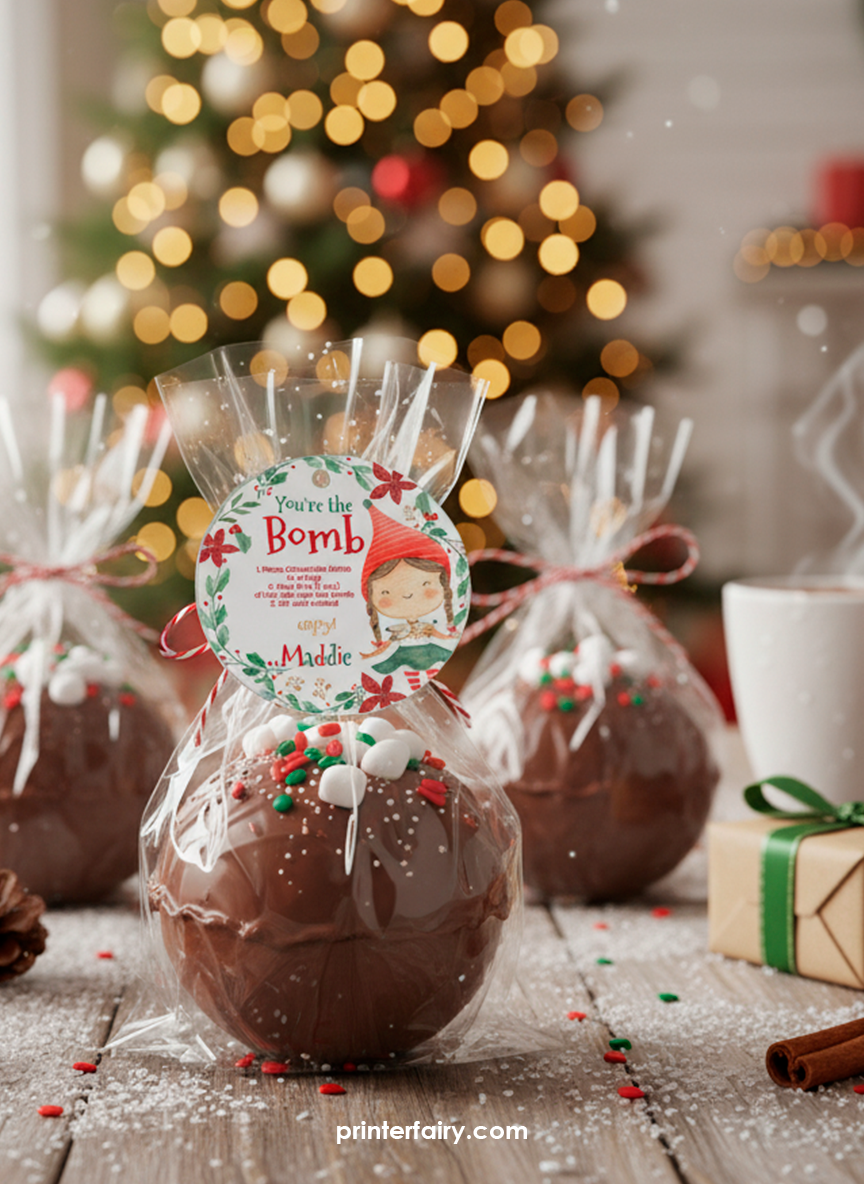 Editable round label template, perfect for packaging your homemade Hot Cocoa Bombs — or any other holiday product. Customize with your shop name, ingredients, instructions, prices, or a festive message to create professional stickers in minutes.