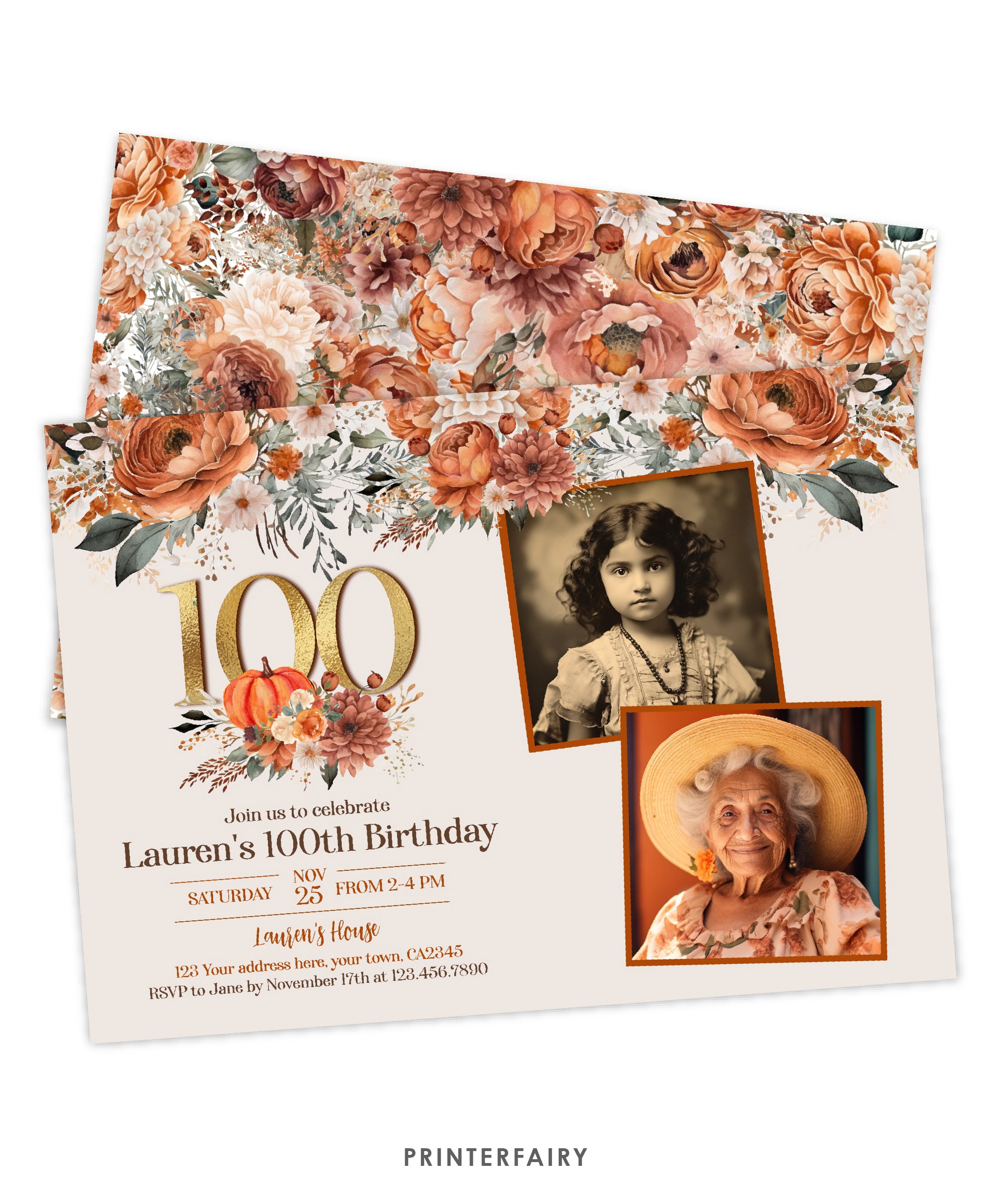 Floral Pumpkin 100 Years Birthday Invitation with Photo