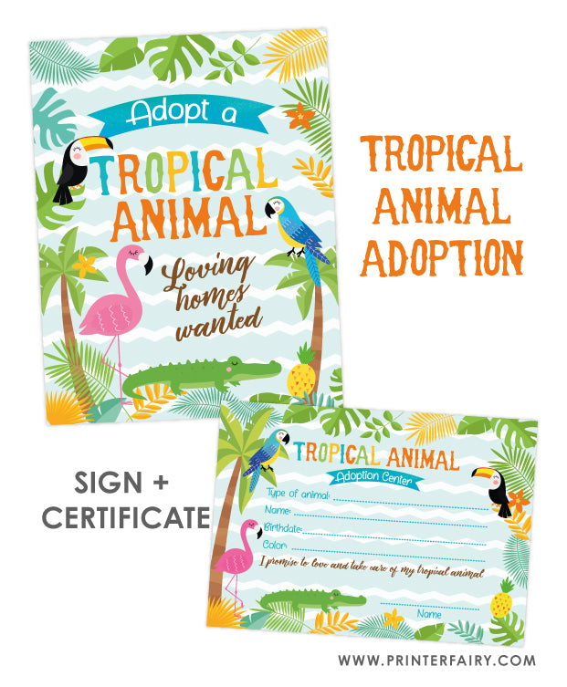 This listing is for a NON EDITABLE digital printable Tropical Animal Adoption Pack. Nothing personalized or physical will be shipped.