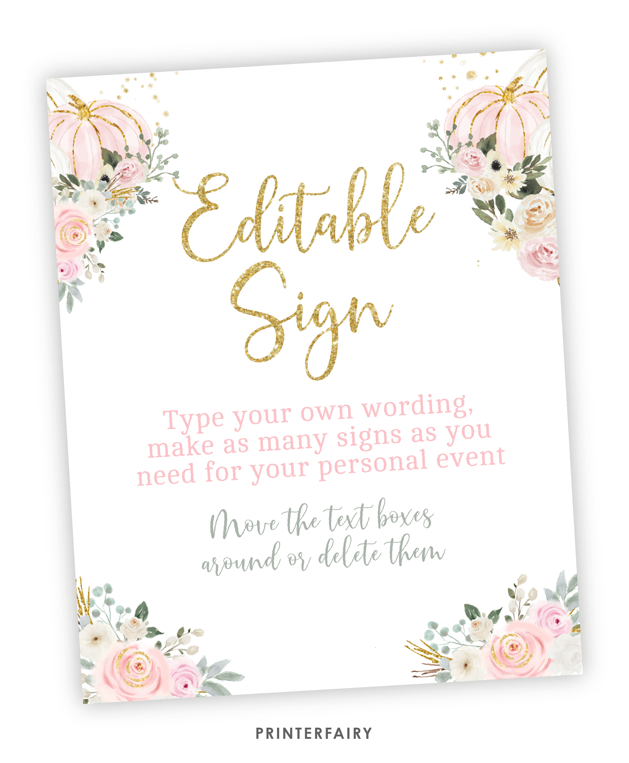 Pink Gold Pumpkin Baby Shower Editable Sign