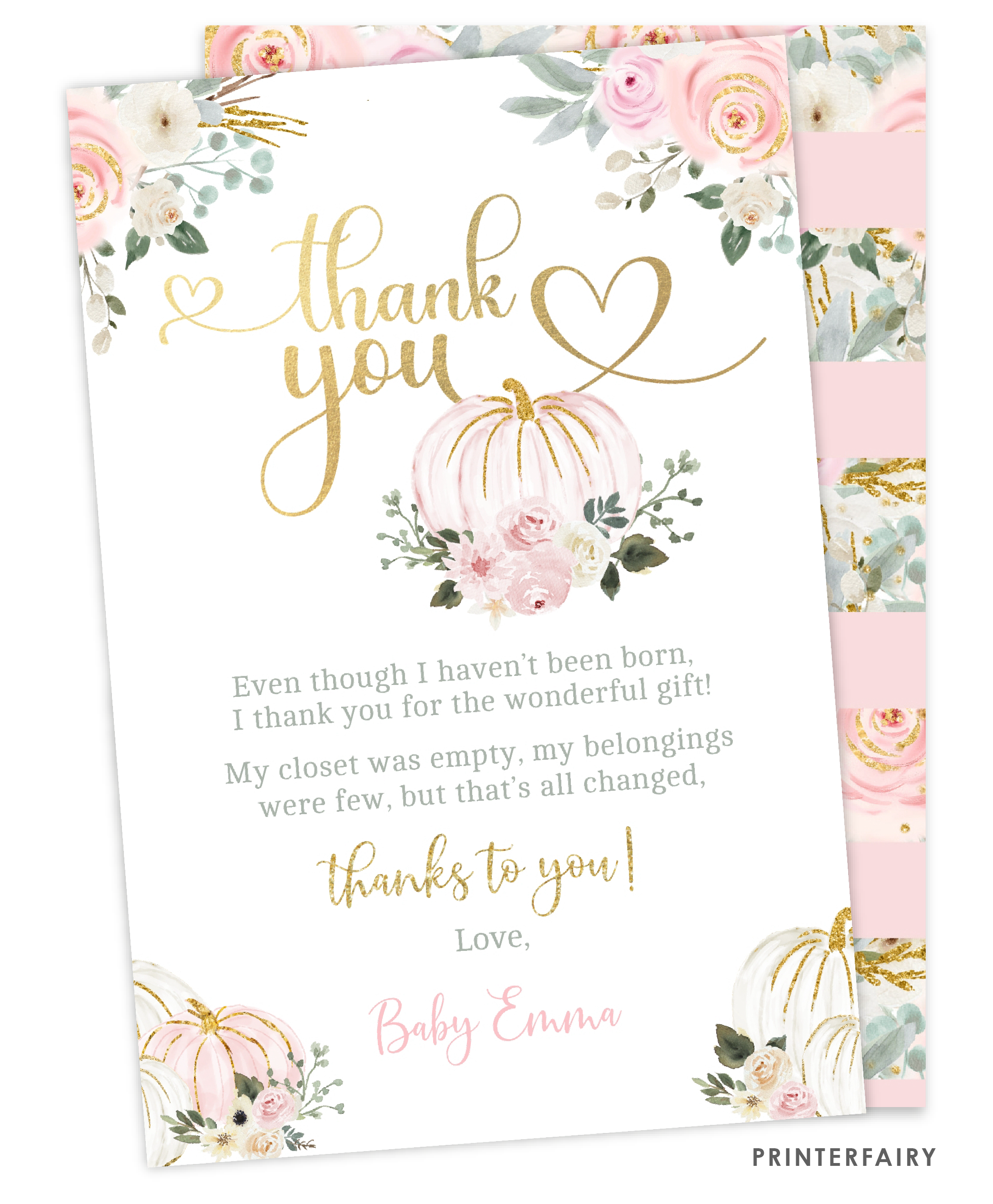 Pink Gold Pumpkin Baby Shower Thank You Notes