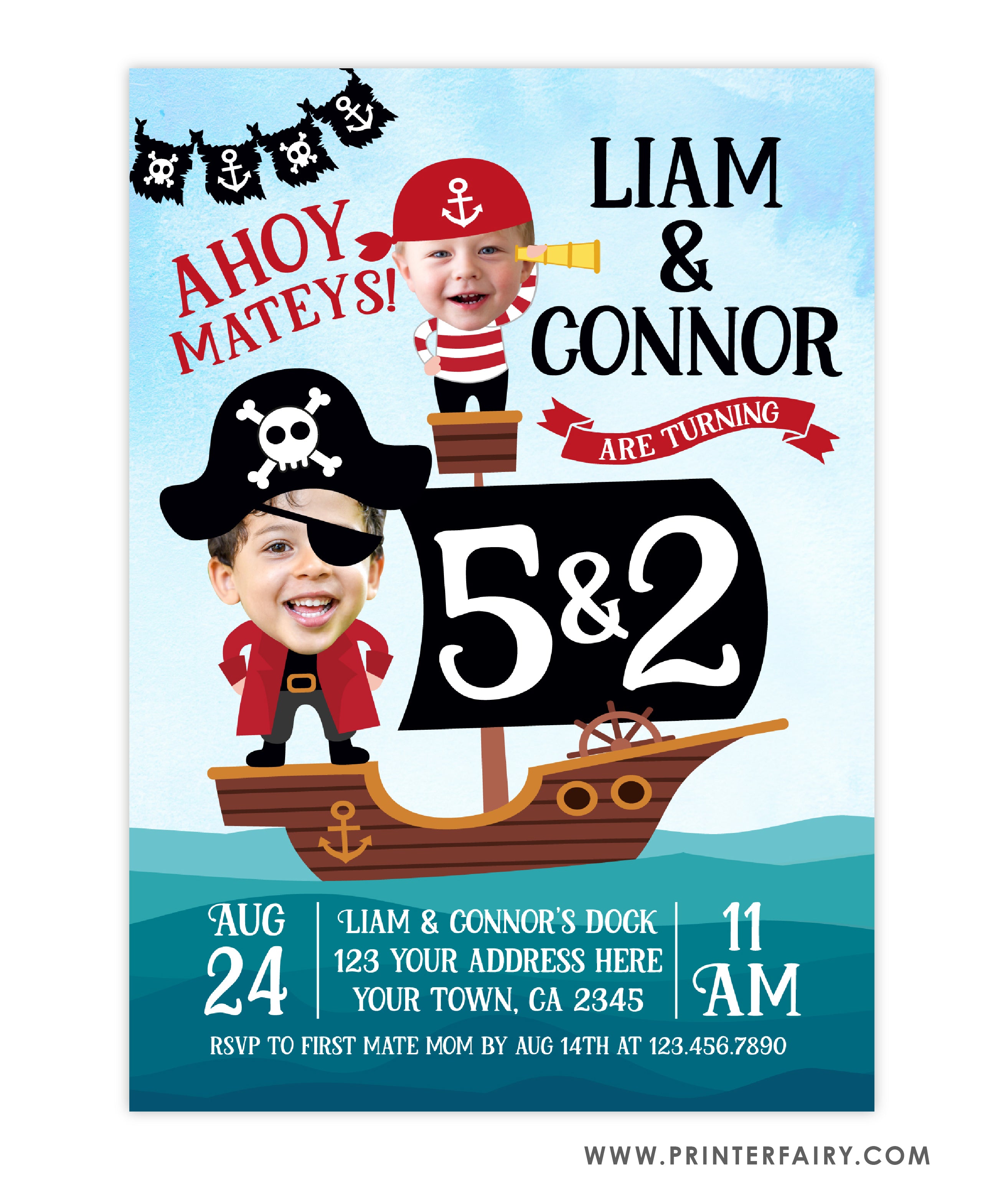 Pirate Birthday Invitation for Siblings - Place Your Face