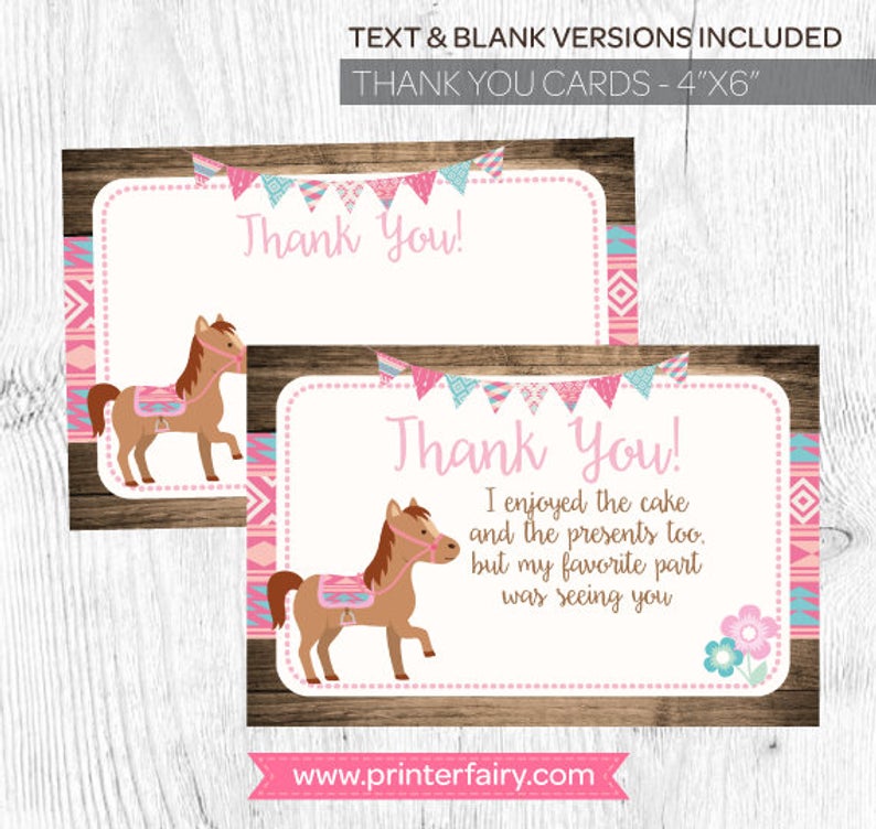 This listing is for a NON EDITABLE digital printable Pony Thank You Card. Nothing personalized or physical will be shipped.