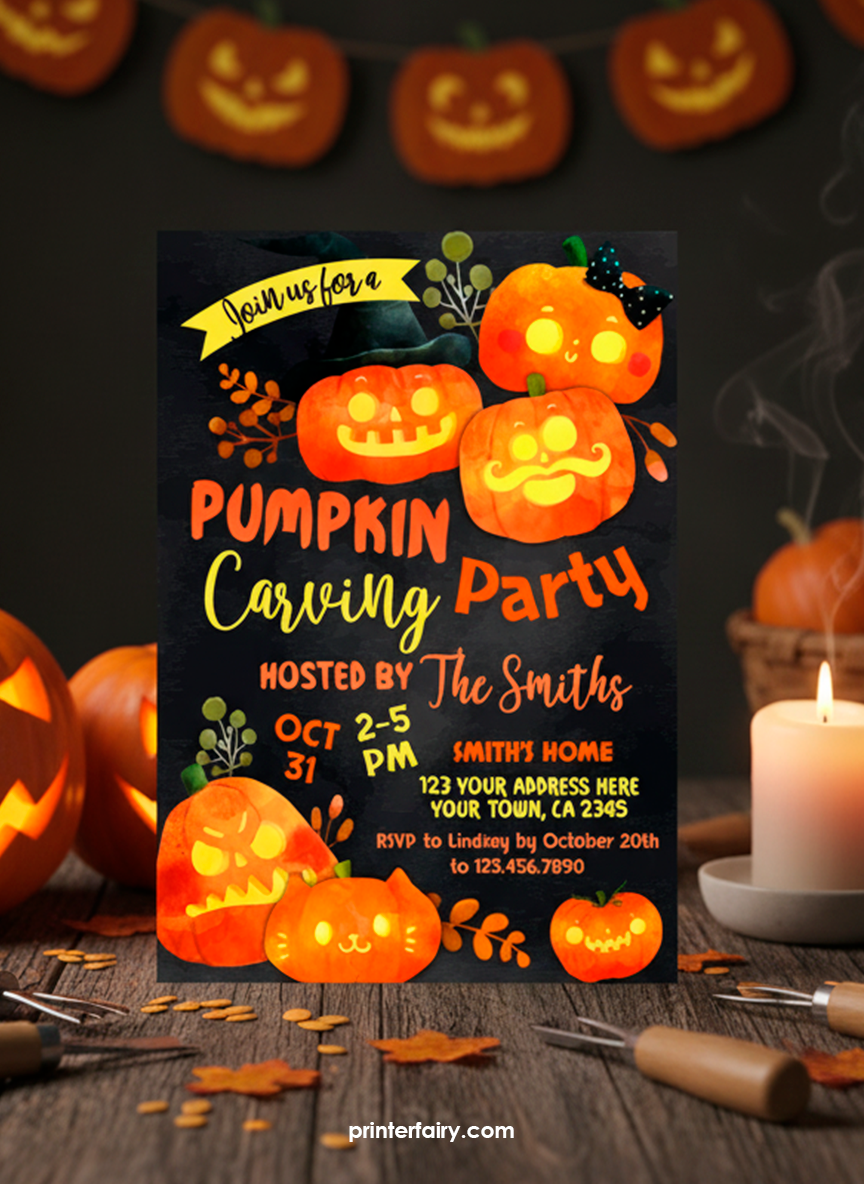 Host the perfect pumpkin carving night! Customize all text right in your browser and print your spooky invite in minutes. Try the demo before purchasing.