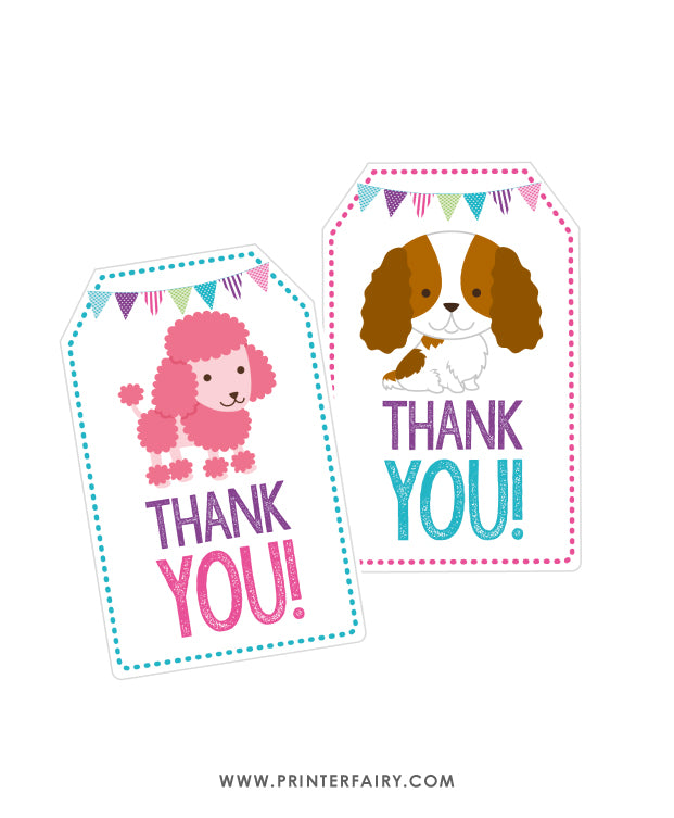 9 unique puppy favor tags in a high resolution, ready to print PDF letter size page (8.5x11 inches).