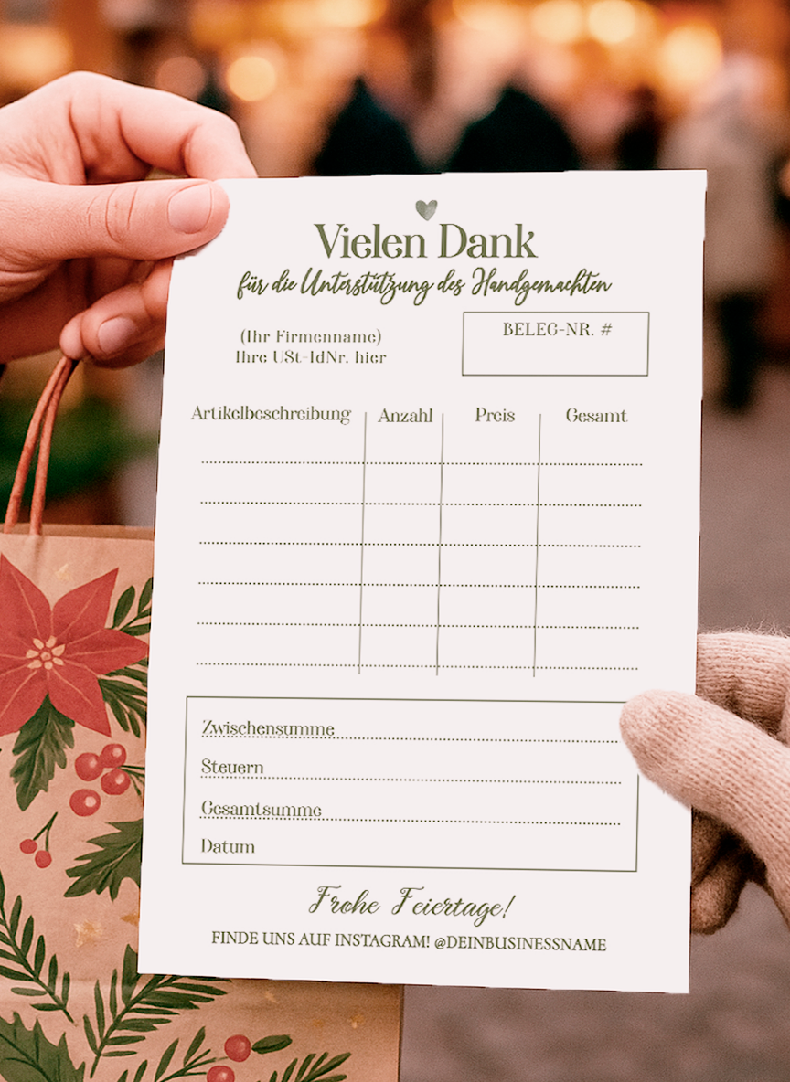 Vollständig editierbare Quittungsvorlage. Ideal für Märkte, kleine Geschäfte oder handgemachte Produkte. Enthält 2 Formate. Demo vor dem Kauf testen!
