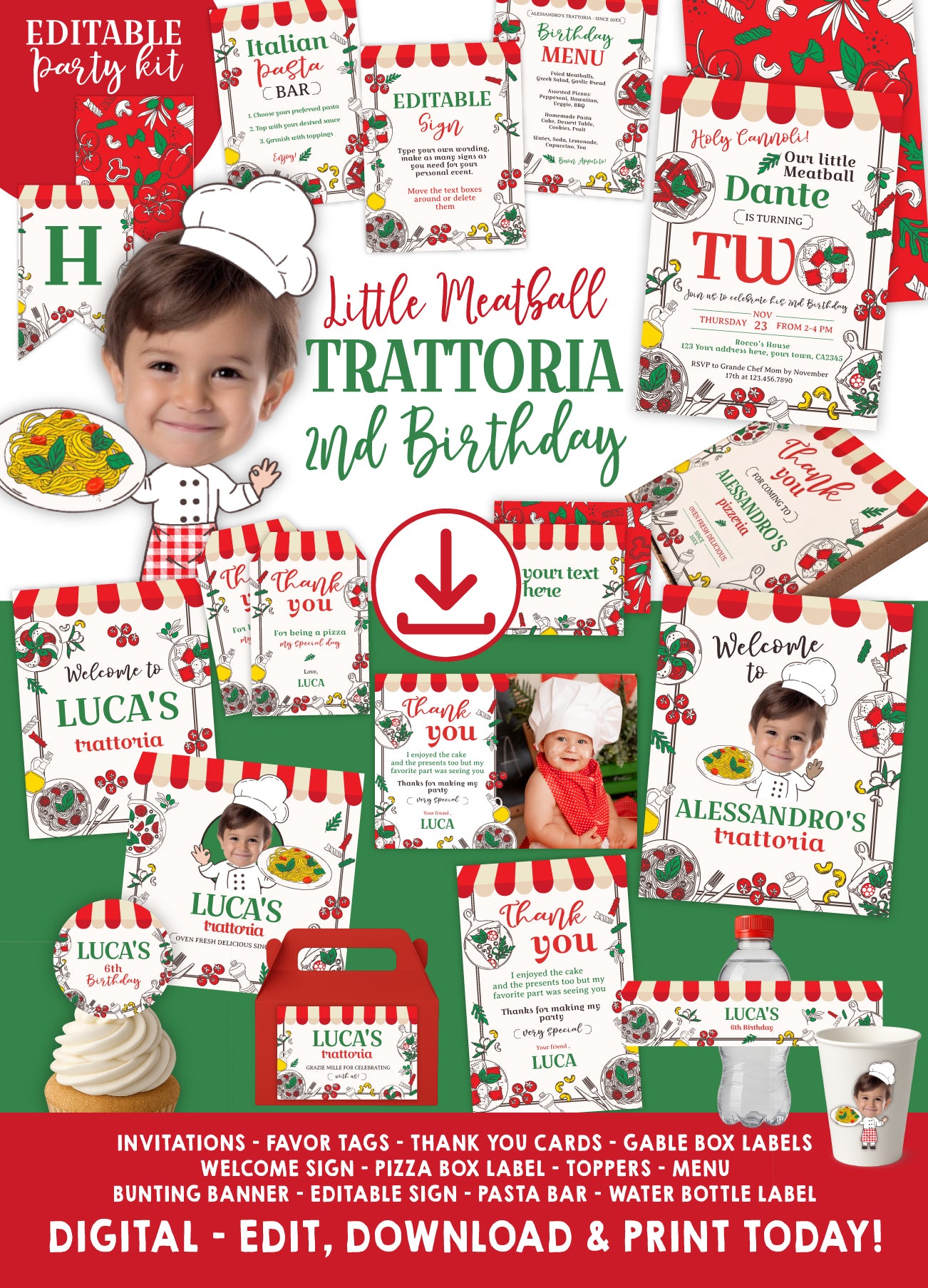 Little Meatball Trattoria 2nd Birthday Party Bundle. ★ EDITABLE WITH CORJL.COM ★ This listing is for an Editable digital bundle. Nothing personalized or physical will be shipped!
